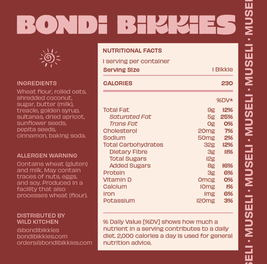 Wheat flour, rolled oats, shredded coconut, sugar, butter (milk), treacle, golden syrup, sultanas, dried apricot, sunflower seeds, pepita seeds, cinnamon, baking soda.
