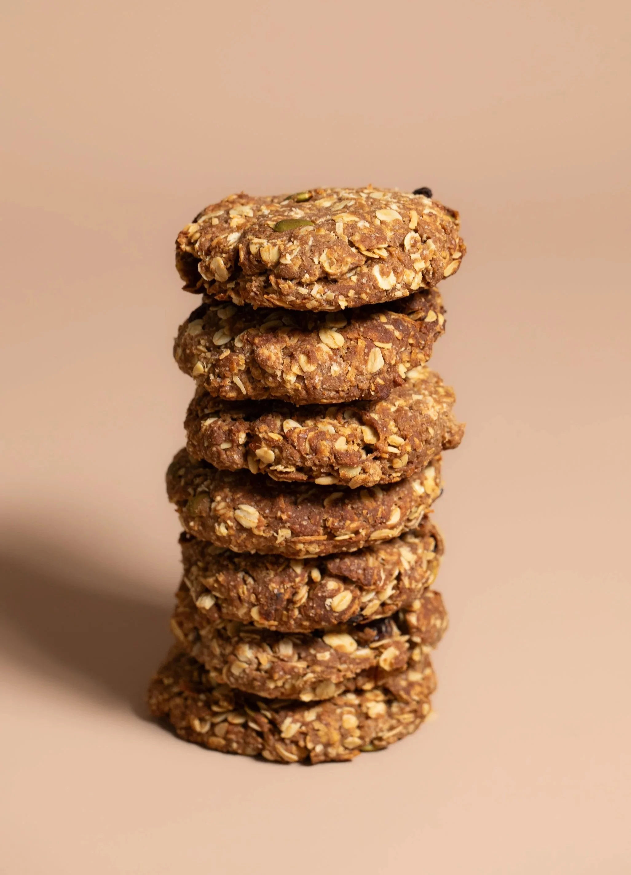 Inspired by the classic Australian Anzac biscuit, this oatmeal cookie is a rustic, comforting, and hearty treat to fuel your adventures. It balances a chewy, soft interior with slightly crisp, caramelized edges and is packed with raisins, apricots, and pumpkin and sunflower seeds. The flavor profile is warm and caramelized with notes of cinnamon.